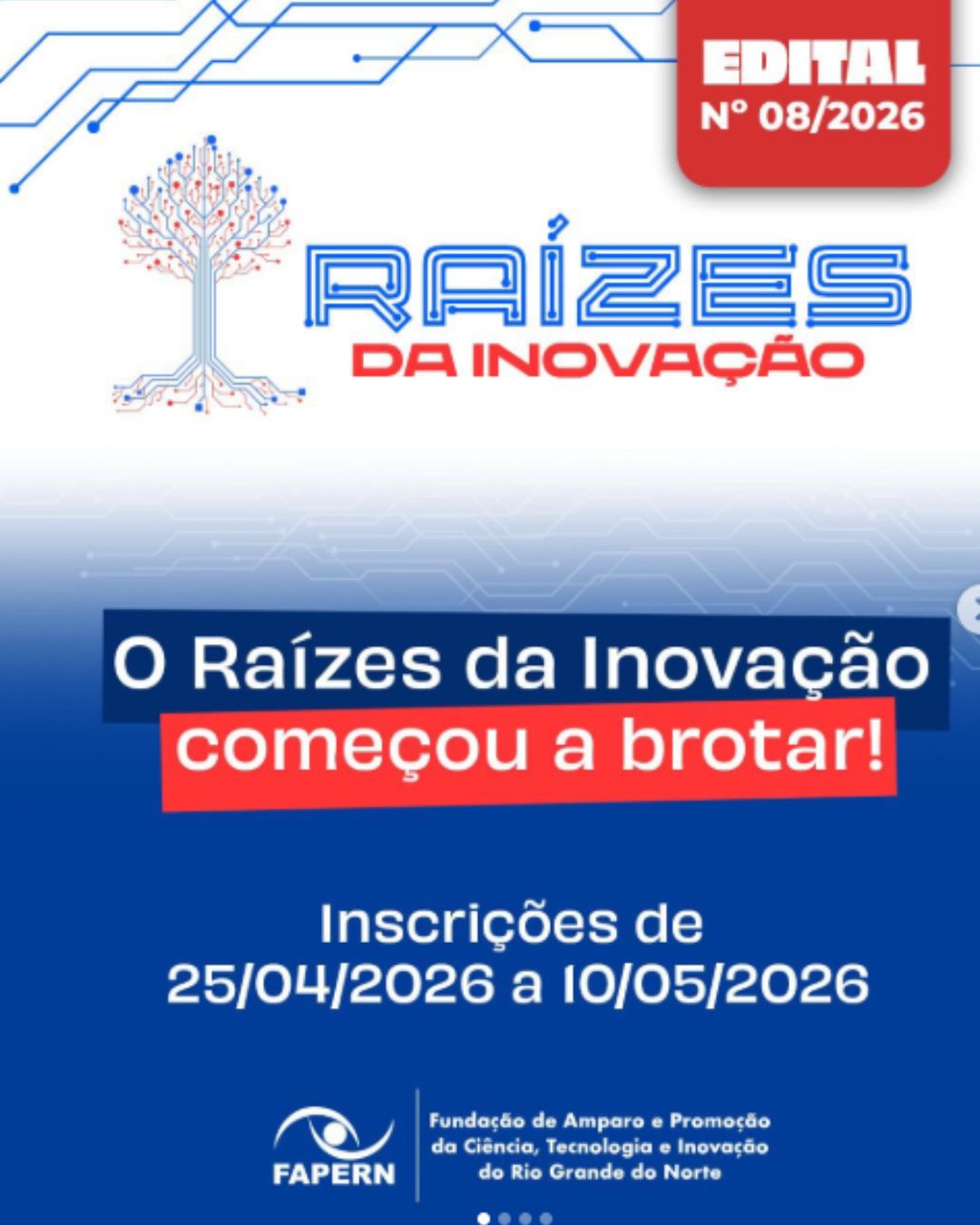 Edital da Fapern oferece 47 bolsas no programa Raízes da Inovação para fortalecer os Ecossistemas Locais de Inovação em todo o RN. Seleção contempla pesquisadores e estudantes com bolsas de até R$ 5,5 mil. Inscrições seguem até 10 de maio e Edital com todas as informações no portal da FAPERN