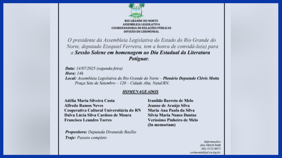 A sessão solene, proposta pela deputada estadual Divaneide Basílio, irá reunir autores, autoras, representantes culturais e admiradores das letras potiguares para prestar uma justa e simbólica homenagem àqueles que contribuem para o fortalecimento e a preservação da literatura no Estado. A iniciativa reconhece o papel fundamental dos escritores e escritoras que, por meio de suas obras, constroem pontes entre passado, presente e futuro da cultura do Rio Grande do Norte.