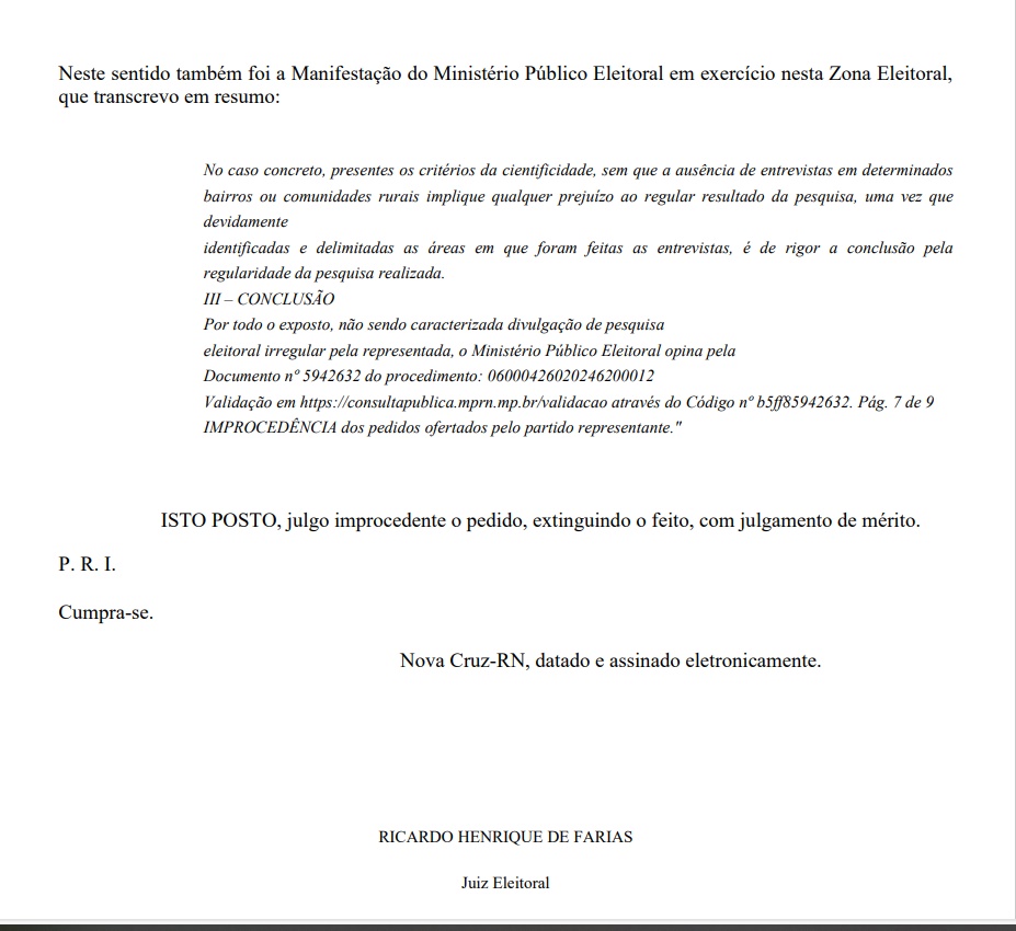 A acusação do PSD contra a pesquisa, alegando supostas irregularidades, foi completamente refutada pela Justiça Eleitoral. Em um parecer cristalino e irrefutável, a Promotoria (Ministério Público Eleitoral) destacou que a pesquisa registrada sob o número RN-05117/2024 foi conduzida de maneira legal e regular, confirmando a total integridade dos resultados apresentados pelo DATA CENSUS.