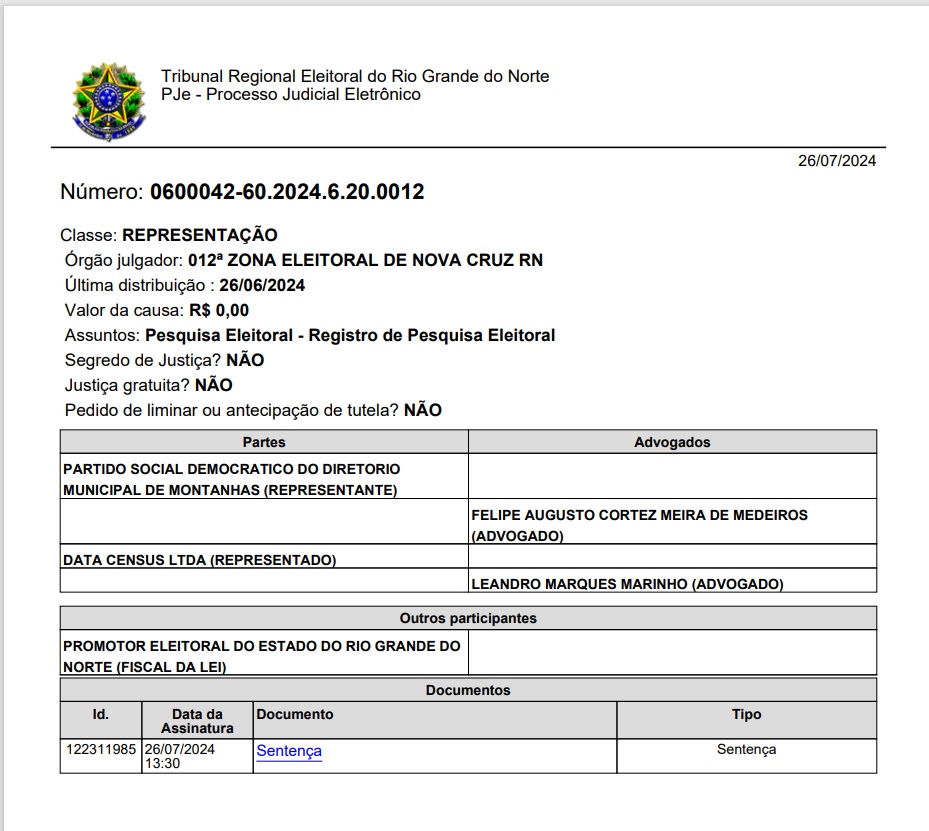 Em um veredicto contundente, a Justiça Eleitoral confirmou a regularidade da pesquisa realizada pelo instituto DATA CENSUS em Montanhas/RN no dia 07 de junho de 2024, desferindo um golpe devastador nas tentativas do Partido Social Democrático (PSD), liderado pelo ex-prefeito Algacir Januário, de invalidar os resultados.
