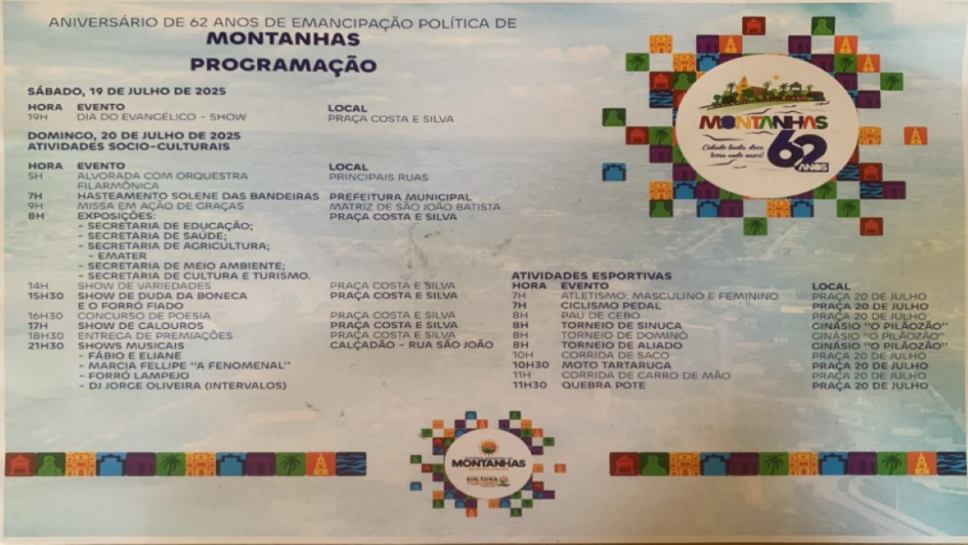 No próximo dia 20 de julho de 2025, o município de Montanhas estará em festa, comemorando com orgulho os seus 62 anos de Emancipação Política. Para marcar essa importante data, a Secretaria Municipal de Turismo e Cultura, por sua secretária Maria do Livramento, juntamente com sua equipe com total apoio da gestão do prefeito Antonio Marcolino Neto, prepara uma programação especial que promete movimentar a cidade e atrair visitantes de toda a região.